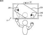 ここで、ユーザは、図14に示すように、表示部13に表示されている特徴点ポインタ83を見ながら、その特徴点ポインタ83に対応する空間を右手の指で左右から包み込み、図15に示すように、その空間を右手の中に収める。即ち、ユーザは、特徴点ポインタ83を掴む。  Here, as shown in FIG. 14, the user wraps the space corresponding to the