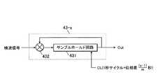 図14に示すように、各サンプル加算回路43−xは、1秒間隔で入力されるラッチクロックCLに基づいて入力電圧をホールドするサンプルホールド回路431と、このサンプルホールド回路431の出力と検波回路18から入力されるタイムコード信号の振幅レベルとを加算する加算回路432とから構成される。ラッチクロックCLは、各サンプル加算回路43−1〜43−mにそれぞれ1秒サイクルで入力されるが、全てのサンプル加算回路43−1〜43−mに同時に入力されるのではなく、各々のサンプル加算回路43−1〜43−mで僅かな時間間隔をずらして入力されるようになっている。例えば、サンプル加算回路がm個ある場合には、これらのサンプル加算回路43−1〜43−mに1/m秒ずつずらしてラッチクロックCLが順に入力されるように構成する。  As shown in FIG. 14, each sample adder circuit 43-x includes a sample hold circuit 431 for holding an input voltage based on a latch clock CL input at intervals of 1 second, and an output of this sample hold circuit 431 and a detection circuit. And an