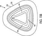 患者の顔面上の接触ラインに対して印加される接触力は、図6、6C、13A〜13Cに示されているように、ガセット部分のアーチ形状壁(56)の厚さを調節することにより、さらに調整することができる。アーチ形状壁(56)は、スプリング構造として作用し、メンブラン(40)を介して患者の顔面上へと接触力の一成分を提供する。アーチ形状壁(56’)は、一様な壁厚さを有したものとすることができる。あるいは、図13Aに示すように、薄い断面を有したものとすることができる。あるいは、アーチ形状壁(56”)は、図13Bに示すように、厚い断面を有したものとことができる。より薄いアーチ形状壁(56’)は、より厚いアーチ形状壁(56”)と比較して、より小さな力成分を提供する。アーチ形状壁(56,56’,56”)の断面積は、ガセット部分(50)の周囲回りにおいて場所ごとに異なるものとすることができる。例えば、ガセット部分は、患者の鼻のブリッジ領域においては、薄い壁のアーチ形状壁を有し、なおかつ、患者の頬領域においては、より厚い壁のアーチ形状壁を有することができる。さらに、アーチ形状壁は、距離(d)の変更に伴って変更することができる。例えば、距離(d)を低減させ、かつ、アーチ形状壁の厚さを増大させることができる。 The contact force applied to the contact line on the patient's face can be adjusted by adjusting the thickness of the arched wall (56) of the gusset portion, as shown in FIGS. 6, 6C, 13A-13C. Can be further adjusted. The arched wall (56) acts as a spring structure and provides a component of contact force through the membrane (40) onto the patient's face. The arcuate wall (56 ') may have a uniform wall thickness. Alternatively, as shown in FIG. 13A, it may have a thin cross section. Alternatively, the arched wall (56 ") can have a thick cross-section, as shown in Figure 13B. The thinner arched wall (56 ') is the thicker arched wall (56") and In comparison, it provides a smaller force component. The cross-sectional area of the arched wall (56, 56 ', 56 ") may vary from place to place around the circumference of the gusset portion (50). For example, the gusset portion may be Can have a thin-walled arch-shaped wall and, in the patient's cheek region, can have a thicker-walled arch-shaped wall. For example, the distance (d) can be reduced and the thickness of the arched wall can be increased.