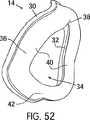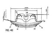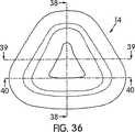 図6、6C、15に示すように、ガセット部分(50)は、顔面接触部分(26)の側壁(36)から外向きに延出されており、顔面非接触部分(24)のフランジ(32)の中へと内向きに湾曲している。特に、ガセット部分(50)は、顔面接触部分(26)の側壁(36)から外向きに延出されている第1側壁(52)と;顔面非接触部分(24)のフランジ(32)から外向きに延出されている第2側壁(54)と;これら第1および第2側壁(52,54)を相互に連結するアーチ形状壁(56)と;を備えている。ガセット部分(50)の壁(52,54,56)は、これらの間にスペース(57)を形成する。したがって、ガセット部分(50)は、平面視において、患者の顔面の輪郭に適合するように曲げられる。図39に示すように、例えば、ガセット部分は、80〜120mmという範囲の、好ましくは95〜105mmという範囲の、曲率半径を有している。 As shown in FIGS. 6, 6C and 15, the gusset portion (50) extends outwardly from the side wall (36) of the face contact portion (26) and the flange (32) of the face non-contact portion (24). ) Curved inward. In particular, the gusset portion (50) extends from the side wall (36) of the face contact portion (26) outwardly from the first side wall (52); from the flange (32) of the face non-contact portion (24). A second side wall (54) extending outwardly; and an arched wall (56) interconnecting the first and second side walls (52, 54). The walls (52, 54, 56) of the gusset portion (50) form a space (57) between them. Thus, the gusset portion (50) is bent to fit the contour of the patient's face in plan view. As shown in FIG. 39, for example, the gusset portion has a radius of curvature in the range of 80 to 120 mm, preferably in the range of 95 to 105 mm.