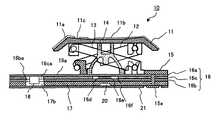 次に動作を説明する。図2において、キートップ11を上方から任意の荷重で押下すると、キートップ11は下方に移動し、これによりラバードーム14が屈曲し、ラバードーム14の接点押下部14aが、図6に示すように、メンブレンシート16の接点部16eを押圧する。これにより接点部16eが接点部16dに接触し、スイッチ閉状態となる。また、第1リンク部材12および第2リンク部材13により、キートップ11の上部のどの部分を押下されても、キートップ11は水平状態を保ったまま下方に移動し、スイッチ閉状態が得られる。図6はスイッチ閉状態を示す断面図である。  Next, the operation will be described. In FIG. 2, when the key top 11 is pressed from above with an arbitrary load, the key top 11 moves downward, whereby the