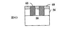 ダマシン工程のまた別の形態において、多孔質オーバーレイ材料は、金属線の形成前に犠牲材料上に配置される。図4Aにおいて、犠牲材料55は基体50上に配置される。多孔質オーバーレイ材料60は次に、図4Bに示すように、犠牲材料55上に配置される。多孔質オーバーレイ材料60および犠牲材料55の両方がパターン形成される。これはフォトレジストを多孔質オーバーレイ60上に配置し、続いて描画、現像およびエッチングすることによって実現される。別法として、多孔質オーバーレイ、または多孔質オーバーレイと犠牲材料の両方が光描画であってもよい。光描画性多孔質オーバーレイが使用される場合、マスクを通じてそれを適切な波長の化学線照射に露光し、続いて現像し、エッチングすることによって、直接描画してもよい。そのようなリソグラフィ工程は当業者に周知である。パターン形成の後、金属線65は図4Cに示すように、気相蒸着、無電解金属めっきまたは電解金属めっきによって、犠牲材料35および多孔質オーバーレイ60内に形成される。図4Cの構造は次に、熱などの犠牲材料55を劣化、分解させる、またはそうでなければ犠牲材料55に、多孔質オーバーレイ材料60を通じて次に除去される揮発性断片または成分を形成させる条件にさらされる。このことは、図4Dに示すように、犠牲材料55が存在していたところへのエアギャップ56の形成を生じさせる。したがって本発明は、基体上に配置された金属線および犠牲材料と、犠牲材料上にかつ金属線に隣接して配置されたオーバーレイ材料とを含む電子デバイス構造も提供する。本発明は、基体上に配置された金属線と、金属線の少なくとも一部と、エアギャップ上にかつ金属線に隣接して配置されたオーバーレイ材料の間に形成されたエアギャップを含む、電子デバイスも提供する。そのような構造の1つの形態において、金属線は銅線である。別の形態において、銅拡散バリアは銅イオン上に配置される。また別の形態において、オーバーレイ材料は銅拡散バリア層として機能する。そのような構造において、オーバーレイ材料は金属線上に配置されていない。  In yet another form of damascene process, the porous overlay material is placed on the sacrificial material prior to the formation of the metal lines. In FIG. 4A, the