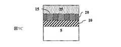 別の形態において、犠牲材料はパターン形成金属線を持つ基体上に配置される。図1A〜1Dは、基体上に犠牲材料を配置する前に金属線が形成される、エアギャップ形成の第一の形態を示す(縮尺は異なる)。図1Aにおいて、基体5上に配置された誘電層10および誘電層10上に配置された金属線15を持つ基体を含む構造が提供される。犠牲材料は次に、図1Bの構造を形成するために図1Aの構造上に配置され、そこで犠牲材料20は誘電層10上および金属線15の間に配置される。図1Cに示すように、多孔質オーバーレイ25は次に犠牲材料20および金属線15の両方の上に配置される。図1Cの構造は次に、熱などの犠牲材料20を劣化、分解させる、またはそうでなければ犠牲材料20に、多孔質オーバーレイ25を通じて次に除去される揮発性断片または成分を形成させる条件にさらされる。このことは、図1Dに示すように、犠牲材料20が存在していたところへのエアギャップ21の形成を生じさせる。  In another form, the sacrificial material is disposed on a substrate having a patterned metal line. 1A-1D show a first form of air gap formation (with different scales) in which a metal wire is formed prior to placing the sacrificial material on the substrate. In FIG. 1A, a structure is provided that includes a substrate having a