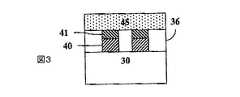ダマシン工程の別の形態において、多孔質オーバーレイが犠牲材料および銅線の両方の上に配置される前に、バリア層を銅線上に配置してもよい。この任意のステップから生じるそのような構造を図3に示す。ここでは銅線40は基体30上に配置され、銅移動バリア層41は銅線40上に配置され、多孔質オーバーレイ材料45はバリア層41上に配置され、エアギャップ36は犠牲材料の除去後に形成される。したがって本発明は、その上に配置された1以上の銅拡散バリアを持つ、基体上に形成された銅線と、銅線および銅拡散バリアの、少なくとも一部の間に形成されたエアギャップと、銅拡散バリアとエアギャップの上に配置された多孔質オーバーレイ材料とを含む電子デバイスを提供する。  In another form of damascene process, the barrier layer may be disposed on the copper wire before the porous overlay is disposed on both the sacrificial material and the copper wire. Such a structure resulting from this optional step is shown in FIG. Here, the