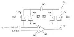 本発明の更なる実施の形態は、上記センサ制御装置を備えた分析物モニタシステムである。分析物モニタシステムは、少なくとも一つの作用電極と、その作用電極または複数の電極に接続された少なくとも一つのコンタクトパッドとを有するセンサも備えている。分析物モニタシステムはまた、センサ制御装置からのデータを受信するレシーバと、レシーバに接続された、分析物レベルの指標を表示するディスプレイとを有する表示装置も備えている。表示装置は、オプションとして、例えば、送信機、アナライザ、データ記憶装置、監視回路、入力装置、電源装置、時計、ランプ、ページャ、電話接続点、コンピュータ接続点、アラームまたは警報装置、ラジオ、および較正装置といった各種構成要素を備えていてもよい。表示装置の更なる構成要素および付加機能は、後で説明する。更に、分析物モニタシステムまたはその構成要素は、オプションとして、薬物または治療プロトコルを決定できるプロセッサおよび/または薬物送達システムを備えていてもよい。