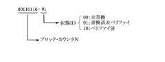 なお、図12に示すように、ブロック別識別ID記憶部を、各ブロックの格納領域から切り離して別テーブルの形で形成してもよい。図12では、ヘッダ部101の中に主識別IDとともに、全てのブロック別識別ID記憶部を集合形成している。また、ブロック別に識別IDを設けず、図13に示すように、現在処理中のブロックを特定する情報と、その処理状態を示す情報とを組み合わせて書換状態識別情報を形成してもよい。図13の例では、次のブロックの処理に進む毎にインクリメントされるブロックカウンタNと、状態IDとを組み合わせている。識別IDは、ブロックカウンタNが示すブロックの状態を示すものであり、未書き換え「00」(無効化にも兼用)、書き換え済未ベリファイ「01」、書換え正常完了「10」の3状態を識別できるように設定されている。  As shown in FIG. 12, the block-specific identification ID storage unit may be separated from the storage area of each block and formed in a separate table. In FIG. 12, all the block-specific identification ID storage sections are formed together with the main identification ID in the