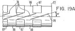 図17の回転切削ダイアセンブリ79は、装置71の両口式シュート構造80に装置のどちら側からでも図18に示されている矢印A方向に脱着可能に取り付けられている装置である。構造80は各々の開口部83および84を通って小型装置の協働供給ローラへ導き導かれる、投入および産出シュート81および82をそれぞれ形成する。回転切削ダイ/供給ローラ72上の刃74は、図19Aに示されるようにローラ軸B−Bに対し角度αに配置される。実施形態の例において角度αは18°であるが他の角度でもよい。しかしながら以下に記載される理由により、好ましくは10°〜80°の範囲内である。図19Bおよび19Cに示されるように、刃は外側の刃の部分がローラの表面から突出しローラの周囲に沿うようにしてローラの表面に埋め込まれる。実施形態の例に示される滑らかな表面の供給ローラ73は、超高分子プラスチックから形成される。ローラは均一の摩耗のため、ローラ72とはわずかに異なる直径を有している。ローラ72および73の間に供給される材料8は、材料を供給し片にスリットを入れるための回転駆動ローラの対向する面の間に挟まれる。  The rotary cutting die