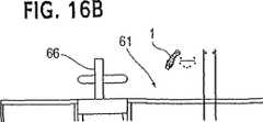 頭上躍動供給コンベア52は、図16Aおよび16Bのシステム60に概略して示され、コンベアは材料ロールを5つの個別包装ステーション61〜65に供給する。包装ステーションのそれぞれには、緩衝材ダンネージを製造し、物品を包装している操縦者、およびワークステーションでのコンテナに分配するための作業面上に支えられる本発明の小型装置1が備えられる。ステーションのうちの一つ、61は、図16Bの側面図に概略して示されている。テープ貼り機は66で示されている。  Overhead