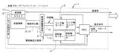 プローブの第3の実施形態は、図17、及び図18のブロック図形式に示される。プローブ301はプローブ1と類似のもので、ハンドル301A及び先端部301Bを含む。先端部301Bは、プローブ1の先端部1Bと実質上同様なものであり、更には説明しない。プローブ1とは異なり、プローブ301は、単一のモーター311を含む。内側軸314は、モーター311により回転駆動される。プローブ1内におけるように、軸314は、上記スライド及び変換器を直線的かつ往復式に駆動させるため、プローブ先端部301B内へと伸長する。クラッチ316は、内側軸314の周囲に取り付けられ、外側軸313は、クラッチ316から延びる。外側軸313は中空であり、内側軸314は外側軸313内を通てって延びる。クラッチ316の係合時において、該クラッチは、内側軸の回転によって外側軸が回転するように内側軸及び外側軸を共にロックする。外側軸は、更に、プローブ1について上述したと同様に、走査機構(該機構は、スライド、スライドロッド、変換器、プーリー及びプリーベルト)を回転させるため、先端部301Bに連結される。外側軸ブレーキ318は、クラッチ316の前方側で外側軸313の周りに取り付けられる。ブレーキ318は、外側軸の回転を防止するように動作可能である。とはいえ、当該キャリッジ全体は、モーターの一つへの通電を通じて回転し得る。  A third embodiment of the probe is shown in the block diagram form of FIGS.