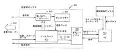 超音波ボックス401のブロック図が図19に示される。超音波ボックスは、プローブ1、201及び301を制御するために使用される。超音波ボックス401は、制御部403と、パルサー/受信部405と、デジタイザー407と、高速データインターフェース409とを含む。超音波ボックス401は、データインターフェース409を介して外部コンピュータすなわちPC411から命令を受け取る。これらの命令は、パルサー/受信部405及びプローブの両方を設定するために用いられる。音響パルスは、パルサー/受信部405において発生し、同軸ケーブル413を通じて走査プローブへと送られる。後方散乱超音波データは、プローブ変換器から超音波ボックス401へと戻され、受信部405で処理される。該データは、次に、デジタイザー407でデジタル化され、制御部403内のメモリーバッファに送られる。該データは、次いで、データインターフェース409を介して、画像形成(結像)及び表示のためにPC411に送られる。  A block diagram of the