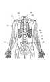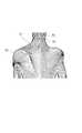 本発明に係る上半身部を有する衣類において、緊締部は、第5頚椎から第7頚椎まで延在する第4緊締部と、第7頚椎の水平ラインの延長線から肩甲骨外側斜め下方にかけて延在する第5緊締部とを備えることとしてもよい。このようにすれば、第4緊締部が第5頚椎から第7頚椎まで延在するため、頚部筋肉が適圧でサポートされ、頚椎の安定性を向上することができ、頭部を支える機能を高めることができる。また、第5緊締部が第7頚椎の水平ラインの延長線から肩甲骨外側斜め下方にかけて延在することで、僧帽筋がサポートされ、僧帽筋の働きを高めることができるため、頚椎の安定性及び頭部を支える機能がさらに強化される。 In the garment having the upper body according to the present invention, the tightening portion extends from the fifth cervical vertebra to the seventh cervical vertebra, the fourth tightening portion extending from the extension line of the horizontal line of the seventh cervical vertebra obliquely downward to the outer side of the scapula It is good also as providing the 5th tightening part to do. In this way, since the fourth tightening portion extends from the fifth cervical vertebra to the seventh cervical vertebra, the cervical muscles are supported with appropriate pressure, the stability of the cervical vertebra can be improved, and the function of supporting the head can be improved. Can be increased. In addition, since the fifth tightening portion extends from the extension of the horizontal line of the seventh cervical vertebra to the obliquely lower side of the scapula, the trapezius muscle is supported and the function of the cervical muscle can be enhanced. Stability and the ability to support the head are further enhanced.