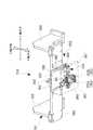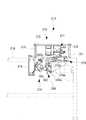 接続作業が完了したら、再度ハンドル14,14を把持し、両仮置きアングル106a,106aをガイドにしてヘッドユニット1を先方に押し入れ、更にその先端部を下げるように傾ける(同図(b))。ヘッドユニット1を傾けてゆくと、本体プレート11の先端部が方形開口124に挿入され、且つ両支持部材13,13の先端が方形開口124の両開口縁部125,125に着地する。両支持部材13,13が開口縁部125,125に着地したら、両仮置きアングル106a,106aから両支持部材13,13を浮かせるようにし、こんどは両支持部材13,13の先端を中心に、ヘッドユニット1を、開口縁部125上をスライドさせながら更に奥に向かって押し込んでゆく。  When the connection work is completed, the