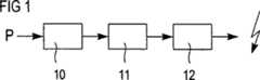 以下では具体的に適用可能な本発明の有利な実施形態を説明する。図2による第1の実施形態は、例えば機器や照明などのスイッチオンのためのスイッチとして使用可能である。非常に好適な適用例は、手動による照明装置のスイッチオン/オフを行う室内の光スイッチである。このスイッチは、配線を全く必要とせず、壁などへ電気ケーブルを敷設する必要がない。このスイッチがプッシュされた場合には、本発明によれば、高周波信号が送信され、つまりこのスイッチに外部から電流が供給されることはない。室内のどこかに、例えばランプの近傍に配置された受信機は、この高周波信号に反応し、当該の照明装置をワイヤレスで遠隔制御されながらオン/オフする。図2には、無線信号を伴った本発明によるプロセスエネルギを使用するワイヤレススイッチにおける、本発明の重要な考察を含んだ部分の構造が概略的に示されている。変換器10(従来のプッシュスイッチ)は、プッシュ操作Pによって作動され、この圧力Pが変換器10の圧電素子に圧電電圧を生じさせる。そのような変換器の圧電材料としては電気音響変換器に対して前述した以外のPVDF(ボリ弗化ビニリデン)や強誘電液晶エラストマー(FLCE)等が特に適している。