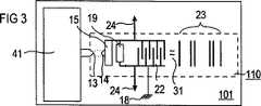 このような火花放電の電流は、電流回路を閉成するためにインダクタンス、例えば広帯域フィルタ20を通流する。このインダクタンス20に現われる電圧降下は、表面弾性波フィルタ21の櫛形構造部22(変換器電極)を給電する。ここでは公知の形態でメカニカル/アコースティックウェーブが生成される。符号化は、フィルタの入力側および/または出力側の櫛形構造部22の特殊な構成によって行われる。符号化に従って配置される反射器ストライプのパターン23が設けられてもよい。その“エコー”が符号化を形成する。フィルタにおいて空胴が形成されるならば、共振振動が生じ得る。そしてその共振振動の正確な周波数からは符号化の形成が可能である。フィルタ出力側からは符号化された信号が得られる。