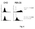 ルイスX構造が一般にPER.C6(登録商標)細胞に存在するのかどうかを突きとめるために、我々はCHO細胞及び通常(すなわち、EPOを産生していない)のPER.C6(登録商標)細胞の表面をルイスX特異抗体(カルビオケム)で標識した。一次抗体(0.16μg/mlで使用されたmAb抗ルイスX、5μg/mlで使用されたmAb抗ルイスX)と共に細胞をインキュベートした。FITCを結合した抗IgMを二次抗体として用いた。標識した細胞をFACSで解析した。破線は、二次抗体のみと共にインキュベートした細胞のシグナル(陰性対照)を表す。図4に示された結果は、これらの構造を生じることができないCHO細胞とは対照的に、PER.C6(登録商標)細胞は抗体で強く標識されることを示した。とりわけ、我々は、PER.C6(登録商標)細胞がルイスX抗体での染色で異質なパターンを呈することを繰り返し観察した。シリアルルイスX構造に特異的な抗体(カルビオケム)による標識は、極めて高い抗体濃度を使用した場合のみ、中程度の陽性シグナルが得られた。Example 7 PER. Expression of Lewis X structure on the cell surface of C6® cells. To find out if it is present in C6® cells, we used CHO cells and normal (ie, not producing EPO) PER. The surface of C6 (registered trademark) cells was labeled with a Lewis X specific antibody (Calbiochem). Cells were incubated with primary antibody (mAb anti-Lewis X used at 0.16 μg / ml, mAb anti-Lewis X used at 5 μg / ml). Anti-IgM conjugated with FITC was used as a secondary antibody. Labeled cells were analyzed by FACS. The dashed line represents the signal of the cells incubated with the secondary antibody alone (negative control). The results shown in FIG. 4 show that in contrast to CHO cells that are unable to produce these structures, PER. C6® cells were shown to be strongly labeled with the antibody. In particular, we have It was repeatedly observed that C6 (registered trademark) cells exhibited a heterogeneous pattern upon staining with Lewis X antibody. Labeling with an antibody specific to the serial Lewis X structure (Calbiochem) gave a moderate positive signal only when very high antibody concentrations were used.