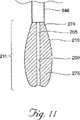 開示される実施形態において、カテーテル201が膨張される場合、膨張媒体275は、代表的には、拡張可能構造体210と中空チューブ205との間の管腔全体を満たし、カテーテル201をこの拡張可能構造体210の長さ全体に沿って拡張しようとする。しかし、カテーテル201の大部分が、シャフト348の管腔内に位置され、カテーテル201の遠位端206は、椎体105内に伸張するため、シャフト348は、望ましくは、拡張可能構造体210の拡張を制限し、主にカテーテル200の遠位端206において、拡張可能構造体210を拡張させる。望ましくは、カテーテル201のさらなる挿入または引き出しは、シャフト348の遠位端から伸張する拡張可能構造体210の量を変え、これにより椎体105内を自由に拡張する拡張可能構造体210の長さを増加または減少する。椎体105へ挿入するカテーテル201の量を選択することによって、医師は、外科的手順の間、拡張可能構造の長さを変え、最終的にカテーテル201により生成されるキャビティ170のサイズを変え得る。従って、開示される実施形態は、様々な長さの複数のカテーテルの必要性を排除および/または軽減し得る。所望ならば、マーク269(図9を参照のこと)が、シャフト348から伸張するカテーテル201の長さに対応するカテーテルの近位端に沿って配置され得、これにより医師は、椎体105内のカテーテル200の拡張可能構造体210のサイズを判断し得る。同様に、以下に開示される代替の実施形態において、キャビティ形成デバイス201は、シャフト348の先端部を越えて伸張する剛毛425の長さに対応するマークを取込み得る。