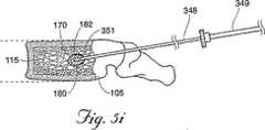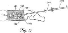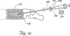 図5Aに示されるように、11ゲージ生検針(Franklin  Lakes,NJのBecton  Dickinson  &  Coから市販される)のような挿入デバイス350は、背部の軟質組織を通って椎体105に挿入され得る。一般的に、このような手順のためのアプローチは、経茎的(transpedicular)であるが、当業者に周知の処置レベルおよび/または邪魔になる解剖学的特徴に依存して、種々のその他のアプローチ(側方アプローチ、茎外(extrapedicular)アプローチおよび/または前方アプローチを含む)が使用され得る。1つの実施形態において、デバイス350は、当該分野で周知のように、針本体348およびスタイレット349を備える。デバイス350の挿入の間、デバイス350の位置は、望ましくは可視化装置(例えば、リアルタイムX線、CTスキャン装置70(図2を参照のこと)、MRI、または当業者に一般的に使用される任意の他のモニタリング装置)を使用してモニタリングされる。これらの装置としては、BrainLab  CorporationまたはGeneral  Electric  Corporationから市販されるシステムのようなコンピュータ補助誘導装置およびマッピング装置を含む。