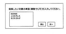 ユーザが入力手段21を操作して、図4に示すキーワード入力欄に「express」、「エクスプレス」、「えくすぷれす」の3つの単語を入力する。その後、図4に示す「次へ」のボタンが選択されると、情報処理装置20は3つのキーワードを含む検索要求信号を検索サーバ10に送信する(ステップ101)。 The user operates the input means 21 to input three words “express”, “express”, and “express” in the keyword input field shown in FIG. After that, when the “next” button shown in FIG. 4 is selected, the information processing apparatus 20 transmits a search request signal including three keywords to the search server 10 (step 101).