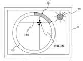 さらに、目標発生告知機能53は、図9に示すように、目標提示マーク101の他に、蛍光画像100の外周部分に方向ナビゲーション表示部121を設け、この場合、合計信号強度が所定の設定レベルを超え、癌等の異常組織(容疑目標)からの蛍光と判断すると、癌等の異常組織(容疑目標)が存在する方向部分の方向ナビゲーション表示部121を点灯させて告知するようにしている。  Further, as shown in FIG. 9, the target