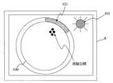 また、目標発生告知機能53は、図8に示すように、合計信号強度が所定の設定レベルを超え、癌等の異常組織(容疑目標)からの蛍光と判断すると、モニタ8に表示されている蛍光画像100に隣接した位置に目標インジケータ111を表示させ、癌等の異常組織(容疑目標)の存在を告知するようにしてもよい。この目標インジケータ111では、蛍光の強度をレベルや色を可変して表示することで、病変部(容疑目標)の大きさ等を反映した告知ができる。  Further, as shown in FIG. 8, the target