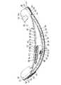 自由部37の頂部分39には、縦方向へ延びる伸縮性弾性部材40が収縮可能に取り付けられている。弾性部材40は、縦方向へ所定の倍率に伸長された状態で頂部分39に固着されている。弾性部材40が収縮すると、物品20Aが表面シート27を内側にして縦方向へ湾曲するとともに、防漏シート29の自由部37が縦方向へ縮んで表面シート27の上方へ起立し、自由部37が排泄物に対する障壁を形成する。物品20Aは、起立する防漏シート29の自由部37によって排泄物の横漏れが防止される。  A stretchable