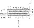 そして、データ線65又は引回し配線66の端部には、液晶駆動回路等を内蔵した駆動用半導体素子(駆動用IC)91が実装されている。さらに、外部接続用端子67のうちの表示領域側の端部にも、駆動用半導体素子(駆動用IC)91が実装されているとともに、他方の端部には、フレキシブル回路基板93が実装されている。The