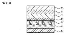例えば、本発明が提供するデバイスの一つである色素増感型太陽電池は、図8に示すように、平滑な基板を剥離した後の透明導電層2の剥離面上に、色素吸着酸化物半導体電極層7を形成し、これに対向して対電極9を配置した後、その色素吸着酸化物半導体電極層7と対電極9の間に電解質8を充填することにより得られる。よって、色素増感型太陽電池の基本構造は、透明基材5、接着剤層4、パターン状の補助電極層(但し、上記第1補助電極層と第2補助電極層とで構成される)3、塗布法で形成された透明導電層2、色素吸着酸化物半導体電極層7、電解質8、及び対電極9で構成されている。For example, as shown in FIG. 8, a dye-sensitized solar cell, which is one of the devices provided by the present invention, has a dye-adsorbing oxide on the peeled surface of the transparent