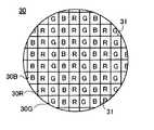 図3に、液晶表示パネル11の表面の一部を拡大して示す。液晶表示パネルには、カラーフィルター層30が設けられている。カラーフィルター層30は画素毎に赤(R)、緑(G)、青(B)の色フィルター30R、30G、30Bがストライブ配列されて形成され、カラーフィルター層を厚み方向で捉えた場合に、カラーフィルター部分という表現で表す。そして、R、G、Bの3つのサブピクセルで1つの画素を構成すると共に、画像をくっきりさせるためサブピクセル毎に遮光性のブラックマトリックス31で囲んでいる。  FIG. 3 shows an enlarged part of the surface of the liquid