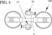 本発明は、現在最も実際的なものであると考えられる実施例、具体例に関して記述いる。したがって、本発明が図示された例に制限されないことは理解されよう。例えば、装置3は、2つのウィンチ16、17が、ハンドルとほぼ平行なラインに沿って並んでいる具体例として示した。これは、正常な用途には実際的なために尊重され、好まれる配置である。しかしながら、これはその他のウィンチの配置であって、特定の状況あるいは適用にふさわしいものを排除しない。そのような可能な修正済の配置例を図3、図4中に示す。図3は、2つのウィンチ16、17が、直角にハンドル4の中心線Cと交差するラインDに沿って並んで位置するツール103の実施例を示す。図4は、2つのウィンチ16、17がハンドル4の異なるサイドに置かれるツール203の実施例を示す。例えば、図3に示した具体例の変形としては、ハンドルの中心線に垂直でないラインに沿って2つのウィンチを並設するものが考えられる。
