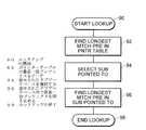 ステップ90でルックアップが開始し、ステップ92に示すように、ポインタ・テーブルで最長一致プレフィクス一致に進む。ステップ94に示すように、最長プレフィクス一致の結果として得られたポインタを、特定のサブデータベースを指示するポインタとして選択する。次に、ステップ96に示すように、選択されたサブデータベースに対して最長一致プレフィクス一致を行い、着信アドレスのプレフィクスと一致するプレフィクスを判断する。一致するものが見つかったら、ステップ98に示すように、当該アドレスについてのルックアップ・オペレーションを終了する。  Lookup starts at