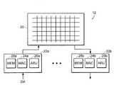 ルーティング機能は、主として着信ライン・カード(たとえばライン・カード22a)上で行うことができ、適切な出力ポートまたはライン・カードへのパケットのスイッチは、スイッチング・ファブリック20内で行うことができる。パケットの宛先アドレス(Destination Address(DA))が、入出力インタフェースを介してライン・カード22aに入力することができる。各ライン・カードは、一般に、メディア・アクセス制御部(Media Access Controller (MAC))24、アドレス解決部(Address Resolution Unit(ARU))26、およびメモリ・デバイス28を含む。MAC24は、CSMA/CD、FDDI、ATM通信プロトコルなどの多くの異なる通信プロトコルを受け付けるように構成することができる。入力MAC24aからパケットが読み取られると、スイッチング・ファブリック20を介してパケットの進路を操作するために必要な転送制御情報が、パケットの先頭および/または最後に付加される。  The routing function can be performed primarily on the incoming line card (eg,