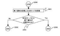 結合子1404の先の処理を図16に示す。終了通知を送信したDBサーバ1〜3を記録する(1601)。終了通知の記録も上記領域移動通知と同様に、前記第1実施形態と同様に行えばよい。続いて、全てのDBサーバ1〜3から終了通知が送信されていないかチェックする(1602)。全てのDBサーバ1〜3から終了通知が送信されていなければ結合子1402の処理へ進む。全てのDBサーバ1〜3から終了通知が送信されていれば結合子1405へ進む。結合子1405の先ではリストア制御部1400の処理が終了する。つまり全てのログ読み込み振り分け部1321〜1323がログを読み終わり、ログ適用処理が終わったことを示す。  The previous processing of the