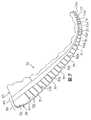 上で述べたように、靴底要素51の各々の形状は、上に向かってミッドソール32内に延び、かつ各靴底要素51の間で延びる切れ目または空間であるサイプ52a〜52lの位置によって決定される。サイプ52a〜52lはまた、ミッドソール32内の分節構造を形成することにより、靴底構造30の柔軟性を高める。通常の靴のミッドソールは発泡ポリマーからなる一体の(まとまった)要素であるが、サイプ52a〜52lは靴底構造30内に屈曲線を形成し、したがってミッドソール32内の曲がりの方向に影響を与える。サイプ52a〜52lの影響で靴底構造30が曲がりまたは分節結合する仕方を、図7に図式的に示す。  As mentioned above, the shape of each of the