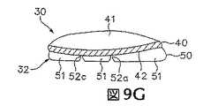 サイプ52eは、前方領域11内での逆方向の屈曲ができるように、他のサイプ52a〜52dおよびサイプ52f〜52lよりも大きな幅を有する。一般に、サイプ52a〜52lは図7に示すように靴底構造30の上向きの曲がりを可能にする。ランニングサイクルの終わりに(つまりつま先が地面を離れる前に)更に地面捕捉力を与えるために、人は足底の屈曲で足指を曲げるかその他の仕方でつま先を地面に押し付ける可能性がある。サイプ52eが広くなっていることにより足底の屈曲が容易になり、それによりランニング中の足の自然な動きが促進される。すなわち、サイプ52eはミッドソール32内に逆屈曲溝を形成している。実験の解析によれば、男性は前方領域内で足底の屈曲を起こす傾向が女性よりも低いことが分かっている。女性における足底の屈曲を起こす高い傾向を助けるために、女性用に設計された靴10には更に幅の広いサイプ52eを持たせるか、またはサイプ52dの幅も大きくすることができる。従って女性用に設計された靴10では、図10Aの断面図で示されるようにサイプ52dおよびサイプ52eの両方の幅を広くすることができる。  The