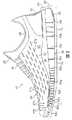 ミッドソール32を形成するには複数の製造方法を好適に使用できる。例えばミッドソール32を一体の要素として形成し、その後サイプ52a〜52lを切込み工程によって形成してもよい。ミッドソール32を成型し、その成型過程でサイプ52a〜52lが形成されるようにしてもよい。ミッドソール32に対する適切な成型方法には例えば、射出成型、注入法、圧縮成型などがある。それぞれの成型方法において、ミッドソール32の一般的な形状を有する金型の中に発泡ポリマー樹脂が注入される。金型はサイプ52a〜52lの位置に対応する薄い刃を含む。ポリマー樹脂は金型内および各々の刃の周囲に配置される。材料が硬化するとミッドソール32は金型から取り出され、成型工程の間にサイプ52a〜52lが形成される。サイプ52a〜52lの幅は金型内の刃の厚みを調整することにより制御される。そのため、例えばサイプ52eの逆屈曲特性はサイプ52eを形成する刃の厚みによって調整でき、また他のサイプ52a〜52dおよびサイプ52f〜52lが逆方向に屈曲する程度は対応する刃の厚みにより制御できる。サイプ52a〜52dおよびサイプ52f〜52lを形成する刃に対する適切な厚みの範囲は0.2mm〜0.3mmであり、これにより比較的小さな逆屈曲が得られる。同様に、サイプ52eを形成する金型の部分に対する適切な幅の範囲は3mm〜5mmであり、これによりもっと大きな逆屈曲が得られる。  A plurality of manufacturing methods can be suitably used to form the