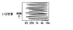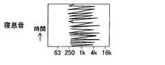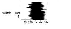 図3〜図5は、ある特定人についての1/3オクターブ3Dの分析結果を示す。図3〜図5において、横軸は周波数を示し、縦軸は時間を示す。音声の強さに対応する物理量(電圧値)は、縦軸及び横軸の双方に交差する軸において表示されるが、色として示されるため図3〜図5では図示が困難であるため省略している。図3は寝息音の分析結果を示す。図3に示すように、寝息音の場合には、一般的には周波数250Hz〜4kHzの領域において出力電圧値がパルス的に振幅し、周期性が認められる。寝息音の場合には一般的には250Hz以下のパルスが少ない。図4はいびき音の分析結果を示す。図4に示すように、いびき音の場合には一般的には周波数63Hz〜16kHzの領域において出力電圧値がパルス的に振幅し、周期性が認められる。いびき音の場合には、1kHz以下、殊に250Hz以下のパルスが多い。図5は人の体動の分析結果を示す。人の体動の際には音のパルスが、非リズム的に発生するので、周期性があまり認められず、体動は寝息音及びいびき音に対して識別される。  3 to 5 show the analysis results of 1/3 octave 3D for a specific person. 3 to 5, the horizontal axis represents frequency and the vertical axis represents time. The physical quantity (voltage value) corresponding to the sound intensity is displayed on an axis that intersects both the vertical axis and the horizontal axis. However, since it is shown as a color, it is not shown in FIGS. ing. FIG. 3 shows the analysis result of the sleep sound. As shown in FIG. 3, in the case of a sleep sound, generally, the output voltage value pulsates in a frequency range of 250 Hz to 4 kHz, and periodicity is recognized. In the case of a sleep sound, there are generally few pulses of 250 Hz or less. FIG. 4 shows the analysis result of the snoring sound. As shown in FIG. 4, in the case of a snoring sound, the output voltage value generally pulsates in the region of