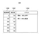 測定距離記憶部126は,RAMやフラッシュメモリなどを含んで構成され,上述のように装置間距離の測定値と測定開始時からの経過時間とを関連付けて記憶する。図5に,測定距離記憶部126の記憶内容の一例を示した。図5に示すように,測定距離記憶部126には,経過時間1260と測定値1262とが関連付けられて記憶されている。経過時間1260はタイマ部122により計測された測定開始時からの経過時間であり,測定値1262は経過時間1260に格納されている時点に測定された装置間距離の測定値である。測定距離記憶部126の記憶内容を参照すれば,測定開始時(測定開始から0ms経過後)には装置間距離は160cmであり,100ms経過後には140cm,200ms経過後には100cmなどのように,時間の経過に沿った装置間距離の変化がわかる。イベント1264には,装置間距離の測定が開始される原因となるイベントと,測定が終了される原因となるイベントの情報が格納される。図5によれば,測定開始のイベントが遠隔操作装置102のボタン押下であり,測定終了のイベントが測定開始から500ms経過であることがわかる。つまり,距離測定部124が,通知受信部120からの開始通知を受けて装置間距離の測定を開始し,測定開始から所定期間(500ms)経過後に測定を終了したことがわかる。  The measurement