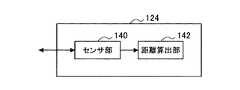 図3は,距離測定部124を詳細に示した図面である。図3に示すように,距離測定部124は,センサ部140および距離算出部142を含んで構成される。センサ部140は,遠隔操作装置102に設けられる受信側センサ部(図示せず)との間でUWB通信を行い,情報処理装置104と遠隔操作装置102との間で電波が空間を飛んだ時間を求める。  FIG. 3 shows the