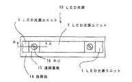また、熱伝導性の高い金属から成る略直方体形状の基台と、この基台の上面に実装した複数の発光ダイオード素子と、この基台の上面に配設したプリント基板とから成り、このプリント基板には前記発光ダイオード素子の各電極と配線パターンを介して電気的に接続した一対の端子電極を有し、この端子電極部を除く前記基台の上面を透光性樹脂によって封止するとともに、前記発光ダイオード光源ユニットの両端部に貫通穴を有し、この貫通穴を挟むように設けられた前記一対の端子電極が何れも前記プリント基板の上面側に設けられた発光ダイオード光源ユニット並びに同じく前記貫通穴を挟むように設けられた前記一対の端子電極が何れも前記プリント基板の下面側に設けられているとともに、前記両端部の下部には前記基台がない発光ダイオード光源ユニットの複数個を、1枚の熱伝導性の高い金属から成る放熱板上に互いの電極部が重なるように長手方向に交互に並べてライン状態にして、前記発光ダイオード光源ユニットを前記放熱板上にネジ止めしたことを特徴とする。Theprinted circuit board comprises a substantially rectangular parallelepiped base made of a metal having high thermal conductivity, a plurality of light emitting diode elements mounted on the upper surface of the base, and a printed circuit board disposed on the upper surface of the base. The substrate has a pair of terminal electrodes electrically connected to each electrode of the light-emitting diode element through a wiring pattern, and the upper surface of the base except the terminal electrode portion is sealed with a translucent resin. The light-emitting diode light source unit has a through hole at both ends of the light-emitting diode light source unit, and the pair of terminal electrodes provided so as to sandwich the through-hole are both provided on the upper surface side of the printed circuit board. Both of the pair of terminal electrodes provided so as to sandwich the through hole are provided on the lower surface side of the printed circuit board, and the base is not provided at the lower part of the both end portions. A plurality of diode light source unit, and the line state alternately arranged in the longitudinal direction so that the electrode portions of the physicianeach other on the heat radiating plate made of a sheet of metal having high heat conductivity overlap, said light emitting diode light source unit It is characterized by being screwed on the heat sink.