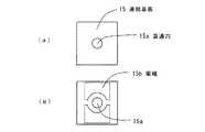 図4において、10はLED光源ユニット1を任意の個数ライン状に並べて構成したLED光源を示している。14は熱伝導性の高い銅合金等の金属から成る1枚の長尺の放熱板を示している。15は図6に詳細を示した連結基板を示している。連結基板15には中央に貫通穴15aが形成されており、背面にはそれぞれが隣接する端子電極3e及び3f同士を接続するための一対の電極15bが貫通穴15aを挟んで形成されている。16は固定用のネジを示しており、図5に示すように、連結基板15をLED光源ユニット1の突き合わせ面の上に被せて、ネジ16によって放熱板14に固定している。  In FIG. 4,