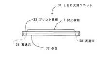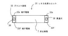 図20、図21において、31は本発明の第4の実施の形態であるLED光源を構成する基本構成要素としてのLED光源ユニットを示しており、32は熱伝導性の高い銅合金等の金属から成る長尺の基台を示している。33は基台32上に接合されたガラエポ等から成る片面配線の1枚のプリント基板を示している。プリント基板33の両端部には上面側にカソード端子電極33e、アノード端子電極33fが設けられており、それぞれが配線パターンを介してLED素子4に接続されている。LED光源ユニット31の両端部には貫通穴38が形成されている。その他の構成は第1の実施の形態と同様であるから同じ構成要素には同じ符号と名称とを付して詳細な説明を省略する。  20 and 21,