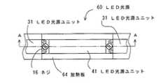 図24、図25おいて、60はLED光源ユニット31、41を交互に任意の個数ライン状に並べて構成したLED光源を示している。64は熱伝導性の高い銅合金等の金属から成る1枚の長尺の放熱板を示しており、放熱板64の上面にはLED光源ユニット31部を沈ませるように段部64bが形成されており、LED光源ユニット41との間に隙間が生じないようにしてある。放熱板64のネジ穴64aに螺合するネジ16がLED光源ユニット31、41の固定と端子電極同士の接続とを兼ねている。  24 and 25,