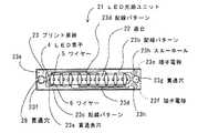 図15〜図17において、21はLED光源を構成する基本構成要素としてのLED光源ユニットを示しており、22は熱伝導性の高い銅合金等の金属から成る長尺の基台を示している。23は基台22上に接合されたガラエポ等から成る1枚の両面配線のプリント基板を示している。プリント基板23には中央に長穴形状の貫通穴としての貫通長穴23aが形成されており、上面には貫通長穴23aに沿って配線パターン23b、23c及び23dが形成されている。配線パターン23b、23c及び23dにはそれぞれ複数の接続電極部が等間隔に設けられている。プリント基板23の一端部には一対のカソード端子電極23e、アノード端子電極23fが上面側に設けられており、28はこの端部に形成されている貫通穴を示している。プリント基板23の他端部にはスルーホール23hを通して下面側にカソード端子電極23e、アノード端子電極23fが設けられており、各々が配線パターン23b、23cに接続されている。貫通穴23gが形成されているこの端部の下側には基台22がない。その他の構成は第1の実施の形態と同様であるから同じ構成要素には同じ符号と名称とを付して詳細な説明を省略する。  15 to 17,