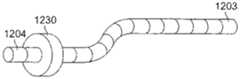 この結果、内視鏡は、内視鏡が移動する管(軌道)の形状を反映する3次元空間における経路を維持する。この様子を図12A〜図12Cに示す。図12A〜図12Cは、複数のたわみモジュール1204(そのうちの1つに符号を付している)と、誘導モジュール1203と、線形変位変換器1230とを備える内視鏡を簡略的に示している。これらの図面は、それぞれ挿入直後(図12A)、挿入中(図12B)、完全な挿入後(図12C)における内視鏡の形状を示している。これらの図面から明らかなように、内視鏡が挿入されるにつれて、所定の挿入の深さにおける向きが保持される。  As a result, the endoscope maintains a path in a three-dimensional space that reflects the shape of the tube (trajectory) along which the endoscope moves. This is shown in FIGS. 12A to 12C. 12A-12C schematically illustrate an endoscope comprising a plurality of flexure modules 1204 (one of which is labeled), a