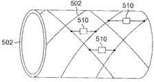 他の実施例として、1本の細長い管を構造的要素として用いてもよい。上述のように、このような構造の設計は、ステントに類似した要素の形式で構成してもよい。例えば、図5に示すように、アクチュエータ510は、メッシュ構造体502の隣接する部材間に配設することができる。ここで、この構成において柔軟性又は弾性を有する材料が用いられている場合、メッシュ構造体502は、この組立体を元の(例えば、実質的に直線状の)形状に復帰するように働く生来的な付勢又は記憶を有することができる。アクチュエータ510を用いることにより、必要に応じて、この構造体をこのような形態から、内視鏡が挿入される内腔の自然な形状を反映する形状にたわませる(deflect)ことができる。勿論、必要に応じて、弾性を有するスリーブ(ここでは、メッシュ構造502内に挿入される)等を用いて付勢力(source of bias)を加えてもよい。  As another example, a single elongated tube may be used as the structural element. As mentioned above, the design of such a structure may be configured in the form of an element similar to a stent. For example, as shown in FIG. 5, the