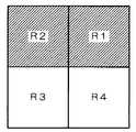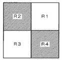 このとき、1つのパターンの幅方向及び高さ方向の画素数が奇数の場合は、図12(B)に示されるように、セルの中心を通り、高さ方向(幅が奇数の場合)並びに幅方向(高さが奇数の場合)に延びる画素を除いて、上述の領域R1〜R4に分割する。なお、1つのパターンの幅方向及び高さ方向の画素数が奇数となる原因の1つとして、画像に拡大縮小等の処理が施されていることがあげられる。 At this time, when the number of pixels in the width direction and the height direction of one pattern is an odd number, as shown in FIG. 12B, the height direction (when the width is an odd number) passes through the center of the cell. The region is divided into the above-described regions R1 to R4 except for pixels extending in the width direction (when the height is an odd number). Note that one of the causes that the number of pixels in the width direction and the height direction of one pattern becomes an odd number is that processing such as enlargement / reduction is performed on the image.