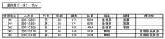 個人情報データテーブル44は、使用者の身体的特徴(性別、年齢、身長、体重)を記憶するもので、携帯端末の入力手段30を利用して入力される。この個人情報データテーブル44のデータは、携帯端末10をサーバ100への接続時に、サーバの記憶手段70に設けた、図5に示すデータ構造を有する、使用者データテーブル74に送られてデータの更新がなされる。この使用者データテーブル74は、例えば、家族内での複数の使用者に関する身体的特徴及びその他の属性(職業、職種)を記録するもので、複数の携帯端末を使用する使用者についてのデータを蓄積して、後述する目的のために使用される。  The personal information data table 44 stores the physical characteristics (gender, age, height, weight) of the user, and is input using the input means 30 of the portable terminal. The data of the personal information data table 44 is sent to the user data table 74 having the data structure shown in FIG. 5 provided in the storage means 70 of the server when the