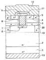 このn-型ドリフト層2の表層部にはp型ベース領域3が形成されていると共に、このp型ベース領域3の上層部分にn+型ソース領域4およびp+型ボディ層5が形成されている。A p-
