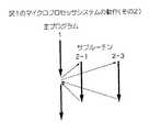 VLIW制御信号が10001〜10000のいずれかのときには、図7に示すごとく、VLIW型プロセッサ2−1、2−2、2−3、2−4のいずれかをプログラム番号指定のプログラム起動する。また、VLIW制御信号が10101のときには、図8に示すごとく、2つのVLIW型プロセッサたとえば2−1、2−3を起動する。さらに、VLIW制御信号が10110、10111のいずれかのときには、図9に示すごとく、全VLIW型プロセッサ2−1、2−2、2−3、2−4を起動する。たとえば、図9においては、RISC型プロセッサ1が主プログラムを実行すると、VLIW型プロセッサ2−1、2−2、2−3、2−4で実行するサブルーチンに同時にリンクする。これにより、VLIW型プロセッサ2−1、2−2、2−3、2−4の並列処理性が向上する。