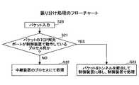 図5は、中継装置20の振り分け部51における振り分け処理のフローチャートを示す。同図中、ステップS20でパケットが振り分け部51に入力され、ステップS21でパケットのTCP宛先ポートが制御装置10で動作しているプロセス23宛であるか否かを判別する。パケットの宛先が制御装置10のプロセス23ではない場合にはステップS22で中継装置20(自装置)のプロセス53にパケットを渡し処理を行う。パケットの宛先が制御装置10のプロセス23である場合にはステップS23でトンネルを通じて制御装置10のプロセス23にパケットを渡し処理を行う。  FIG. 5 shows a flowchart of the distribution process in the